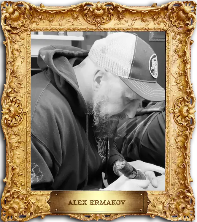 Alex Ermakov is an outstanding black and grey specialist coming all the way from Russia. He loves all things from linework to cover-ups. If you have a project in mind and like the look of his work, please pop into the studio.